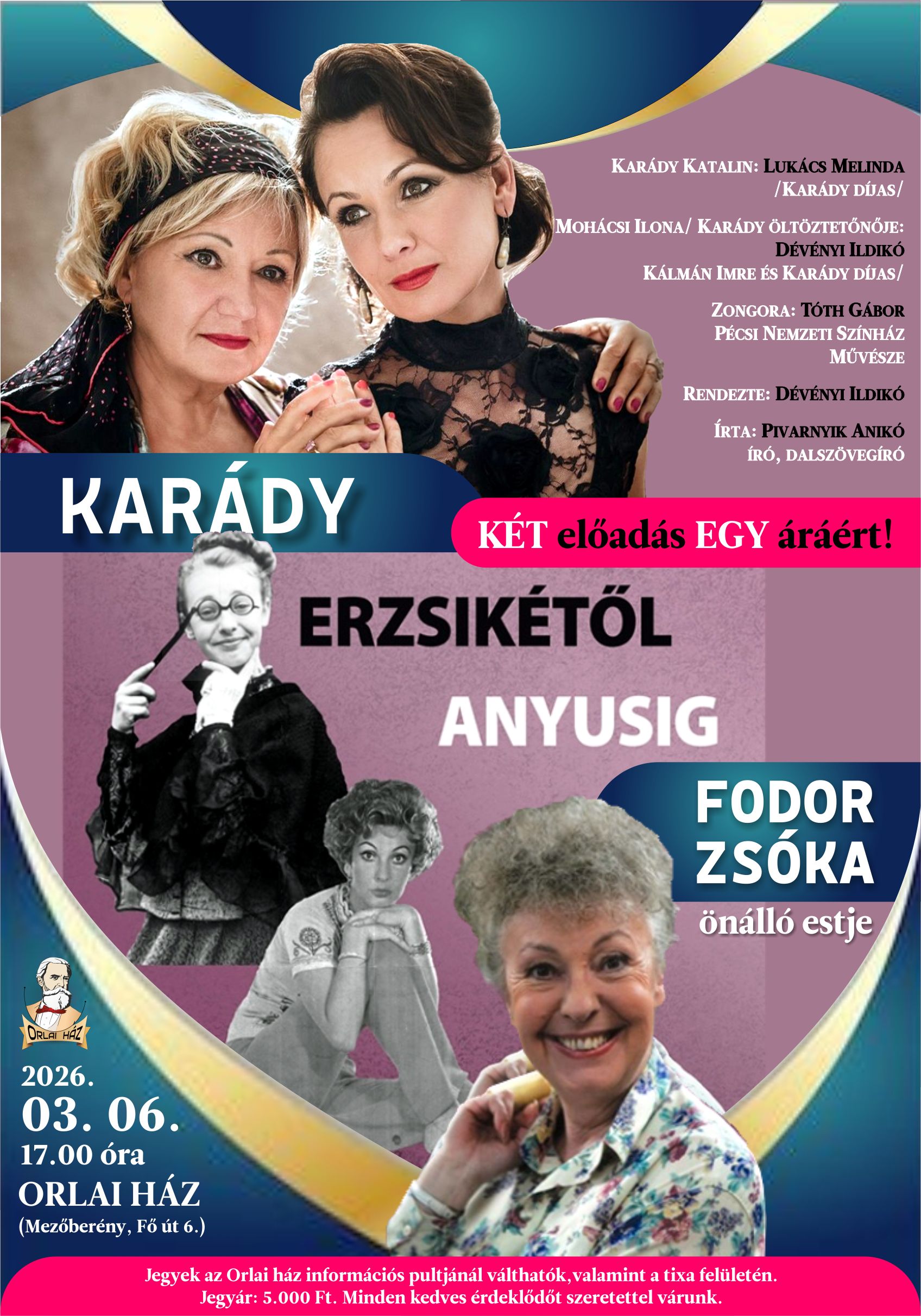 Két előadás egy áráért!By Orlai ház / 2026.01.07. Karády című zenés pódiumjáték, valamint Erzsikétől Anyusig címmel Fodor Zsóka önálló estje!