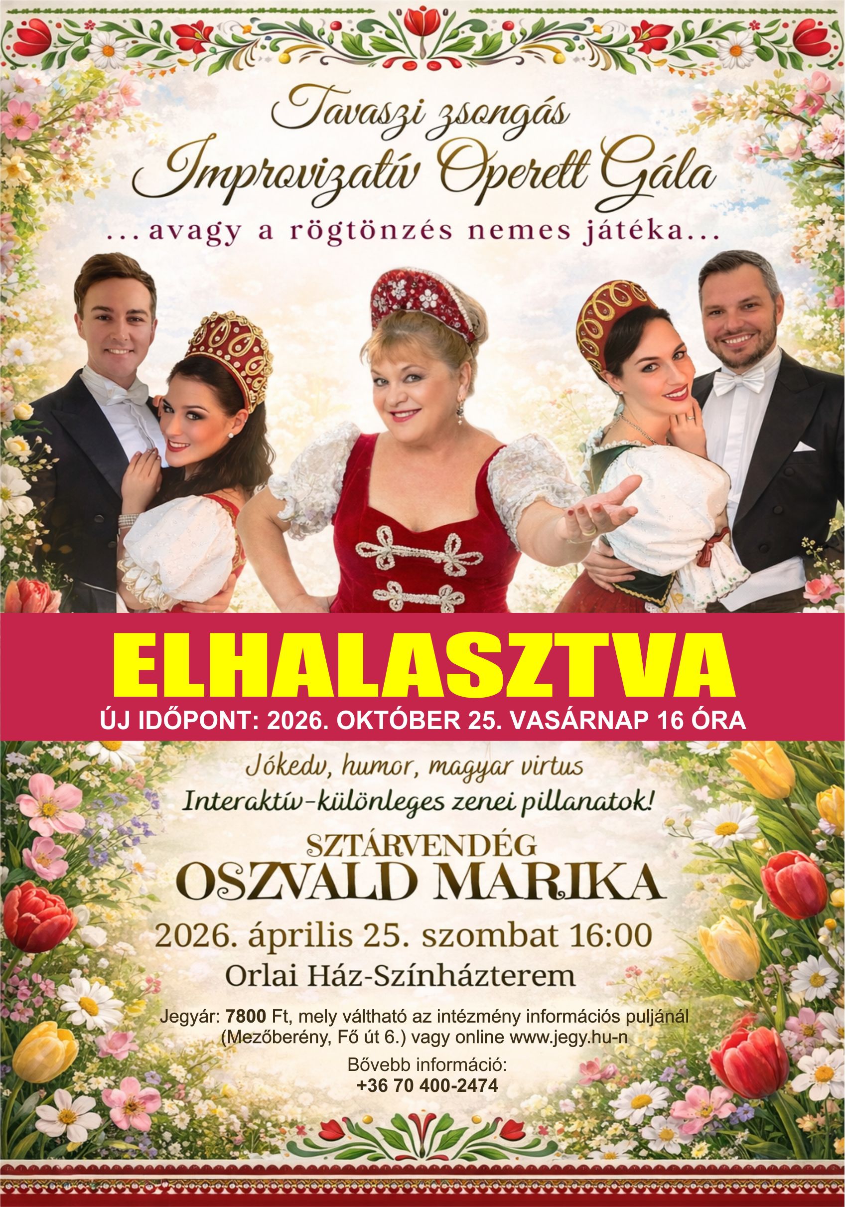 FONTOS TÁJÉKOZTATÁS: Időpontváltozás a Mezőberényi Gálánál Kedves Közönségünk! Sajnálattal tájékoztatjuk Önöket, hogy az április 25-re tervezett Mezőberényi Gála technikai okok miatt elmarad. A rendezvény új időpontja: 2026. október 25. A megváltott jegyekkel kapcsolatos teendők: